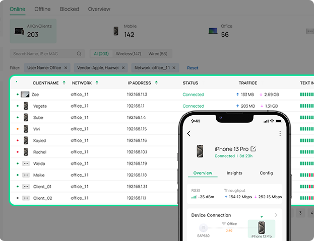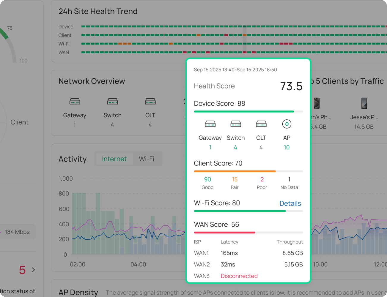 - Stündliche Health-Zeitachsen für APs, Switches und Gateways