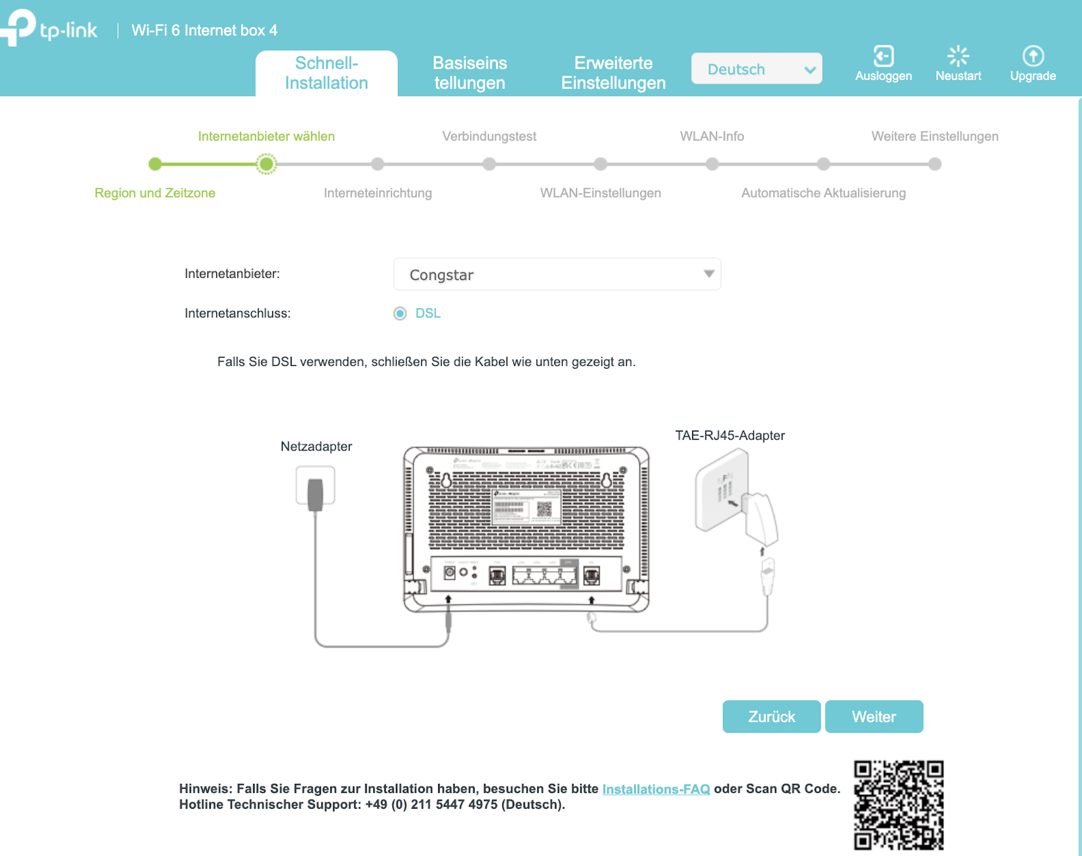 Starten Sie die Schnellinstallation, wählen Sie Region und Zeitzone, wählen Sie Congstar aus der Liste der Internetanbieter und klicken Sie auf Weiter.
