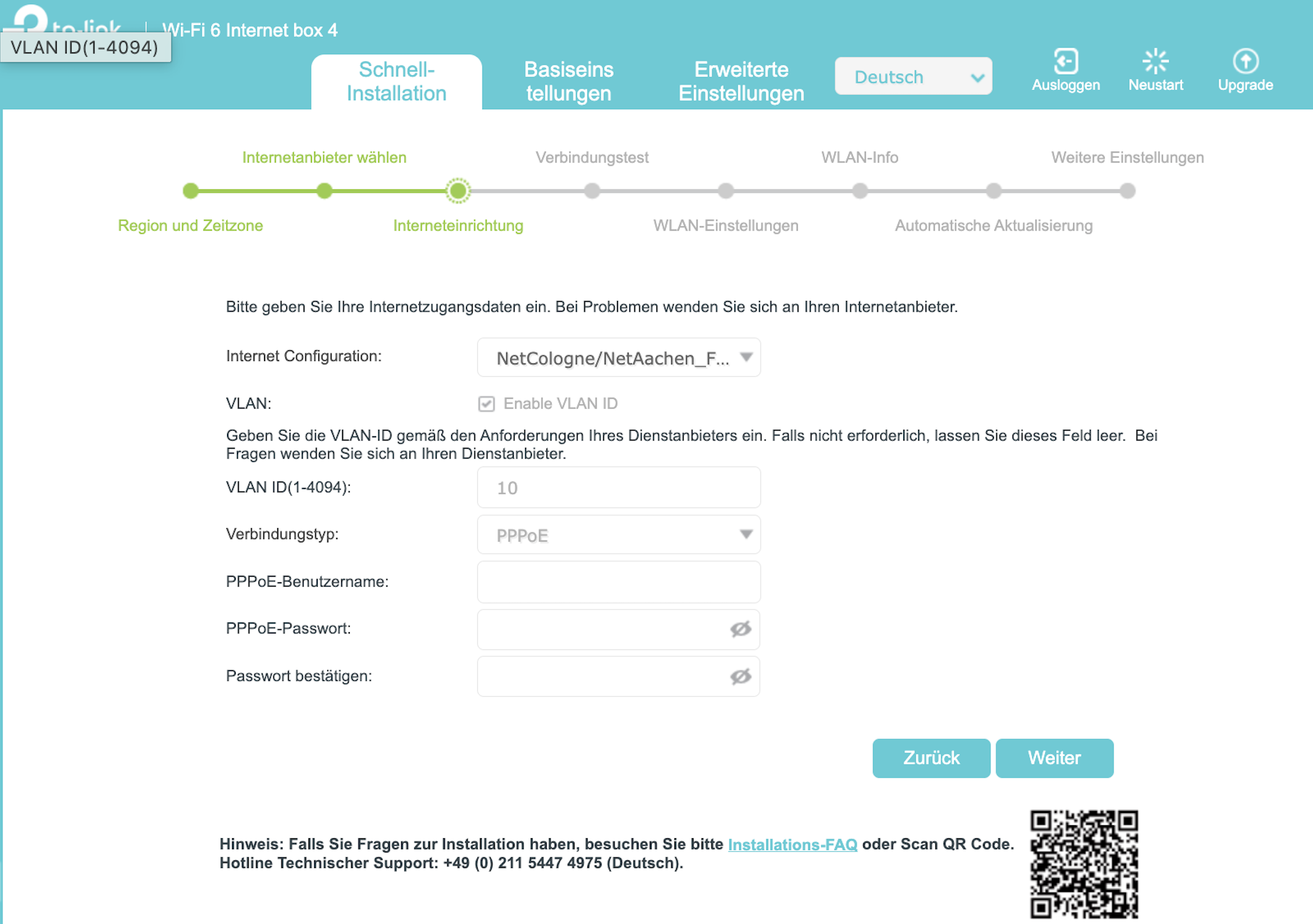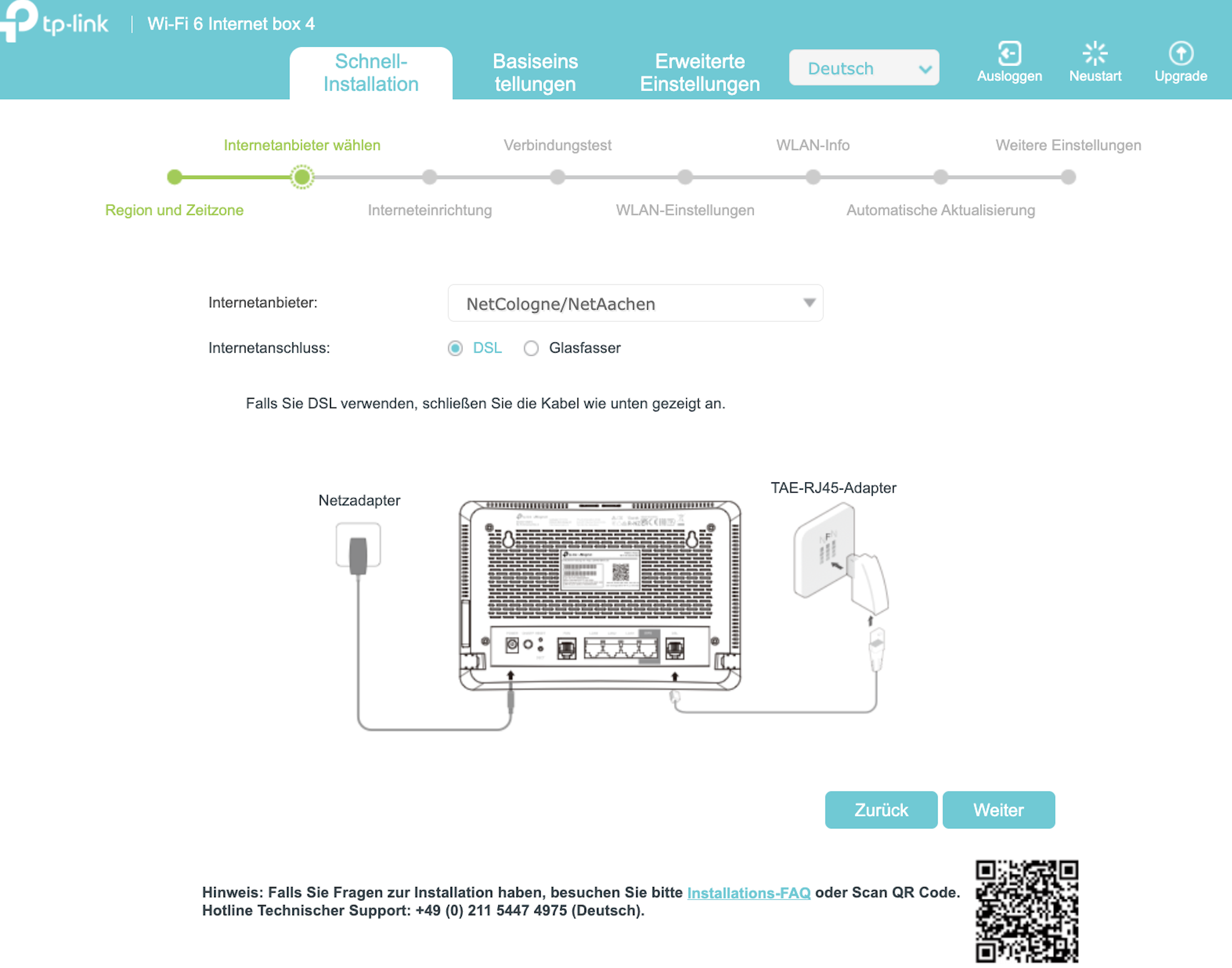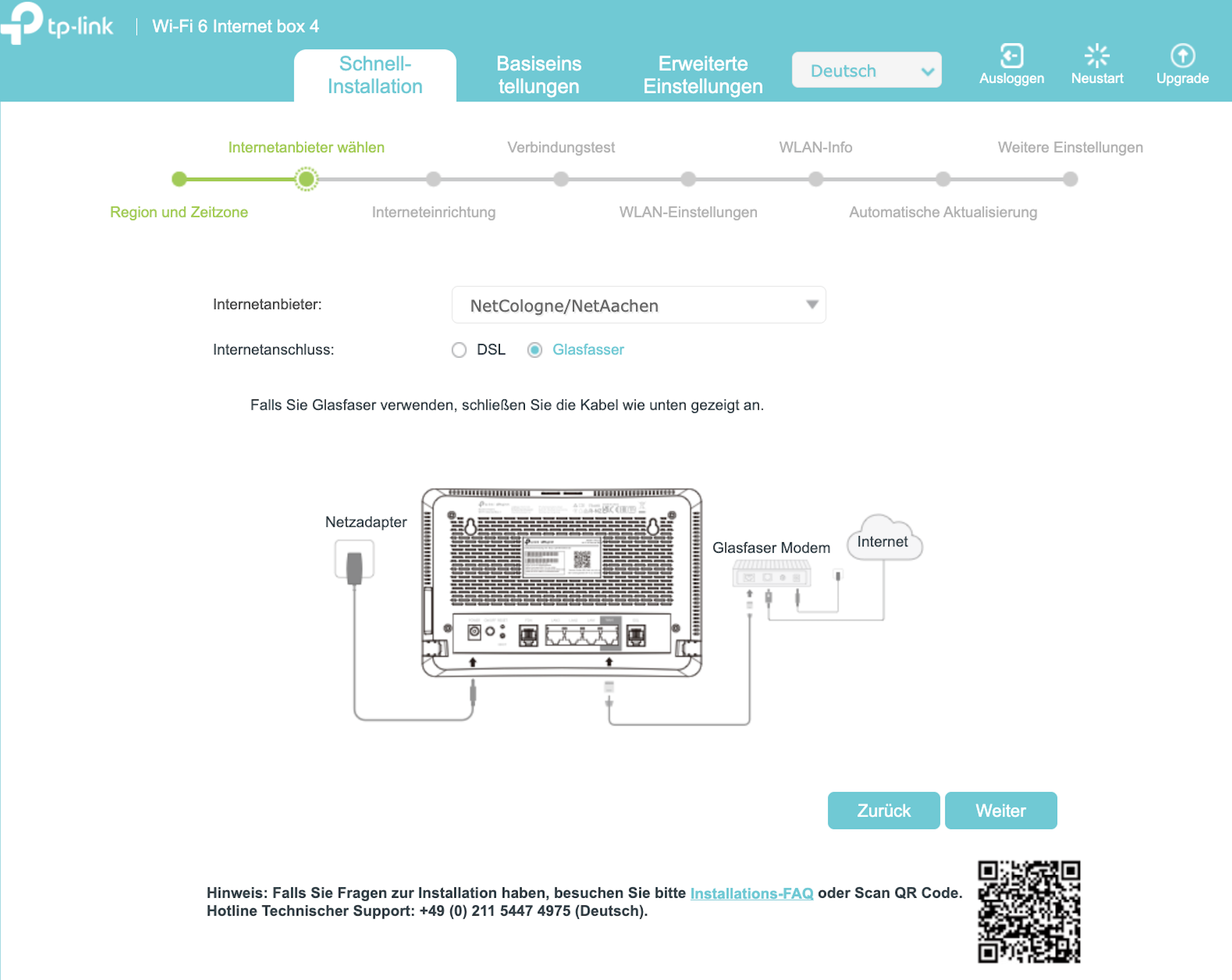 Starten Sie die Schnellinstallation, wählen Sie Region und Zeitzone, wählen Sie Netcologne aus der Liste der Internetanbieter und klicken Sie auf Weiter.