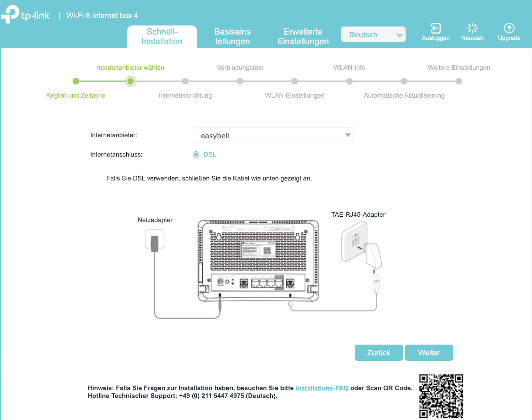 Starten Sie die Schnellinstallation, wählen Sie Region und Zeitzone, wählen Sie Easybell aus der Liste der Internetanbieter und klicken Sie auf Weiter.