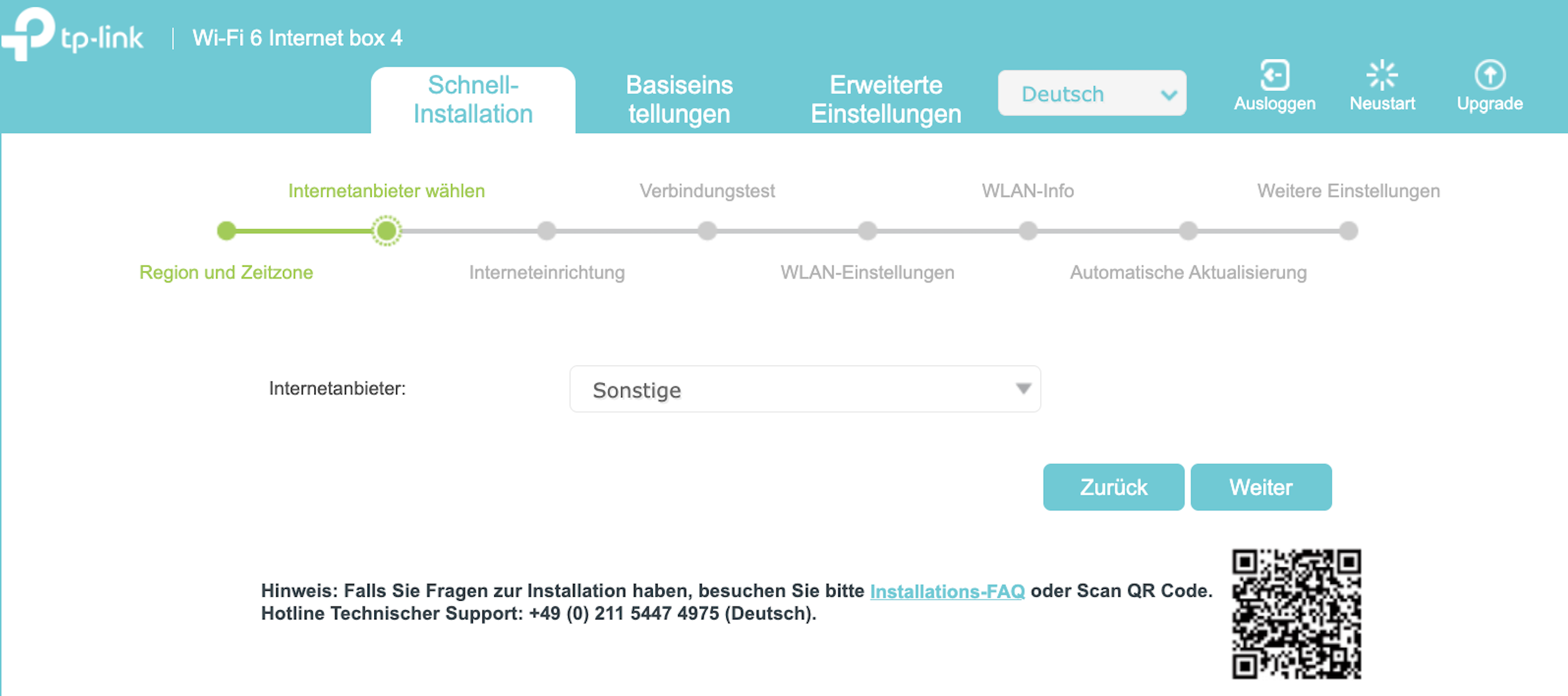 Starten Sie die Schnellinstallation, wählen Sie Region und Zeitzone, wählen Sie wilhelm.tel aus der Liste der Internetanbieter und klicken Sie auf Weiter.
