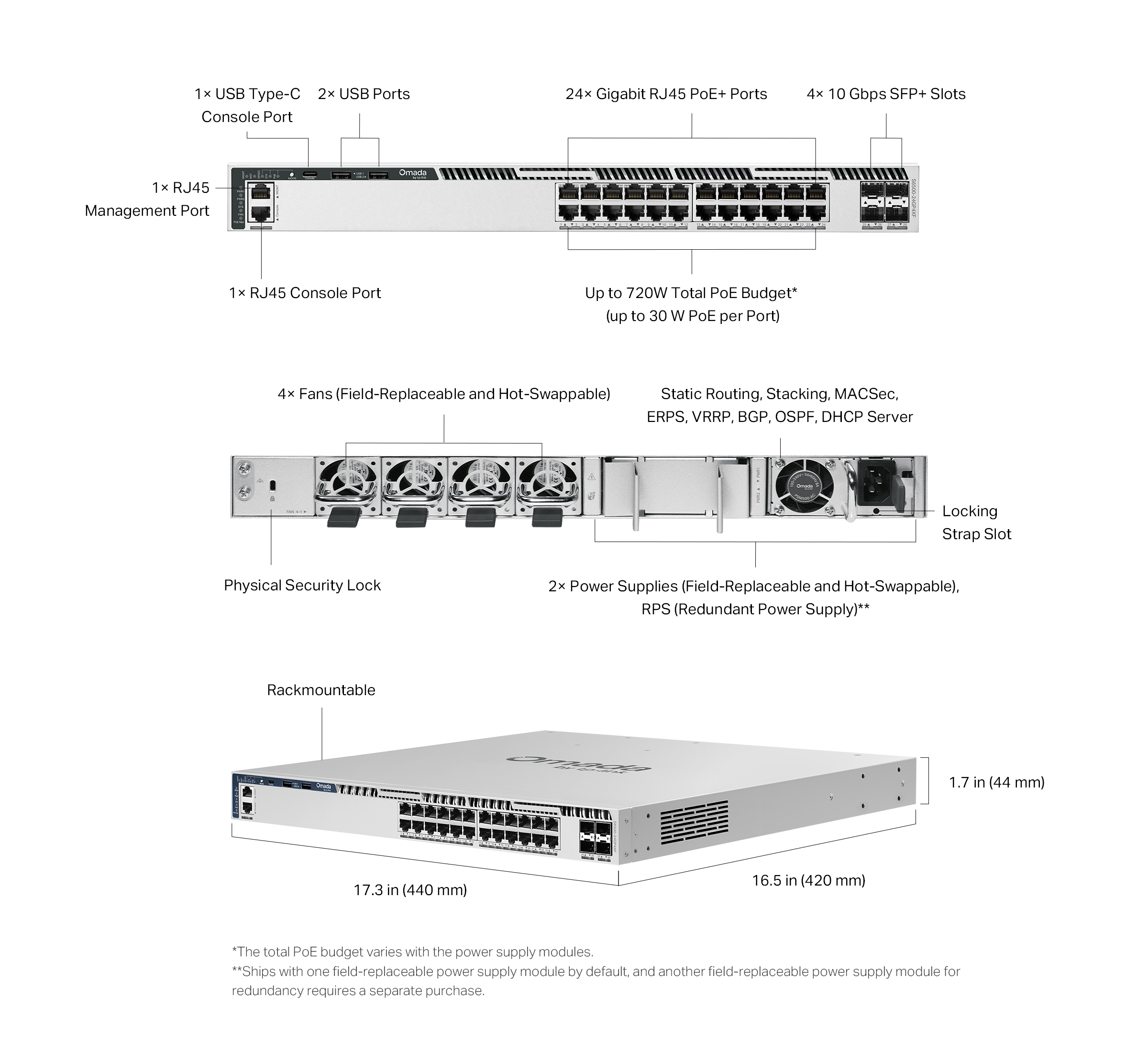 *The total PoE budget varies with the power supply modules.