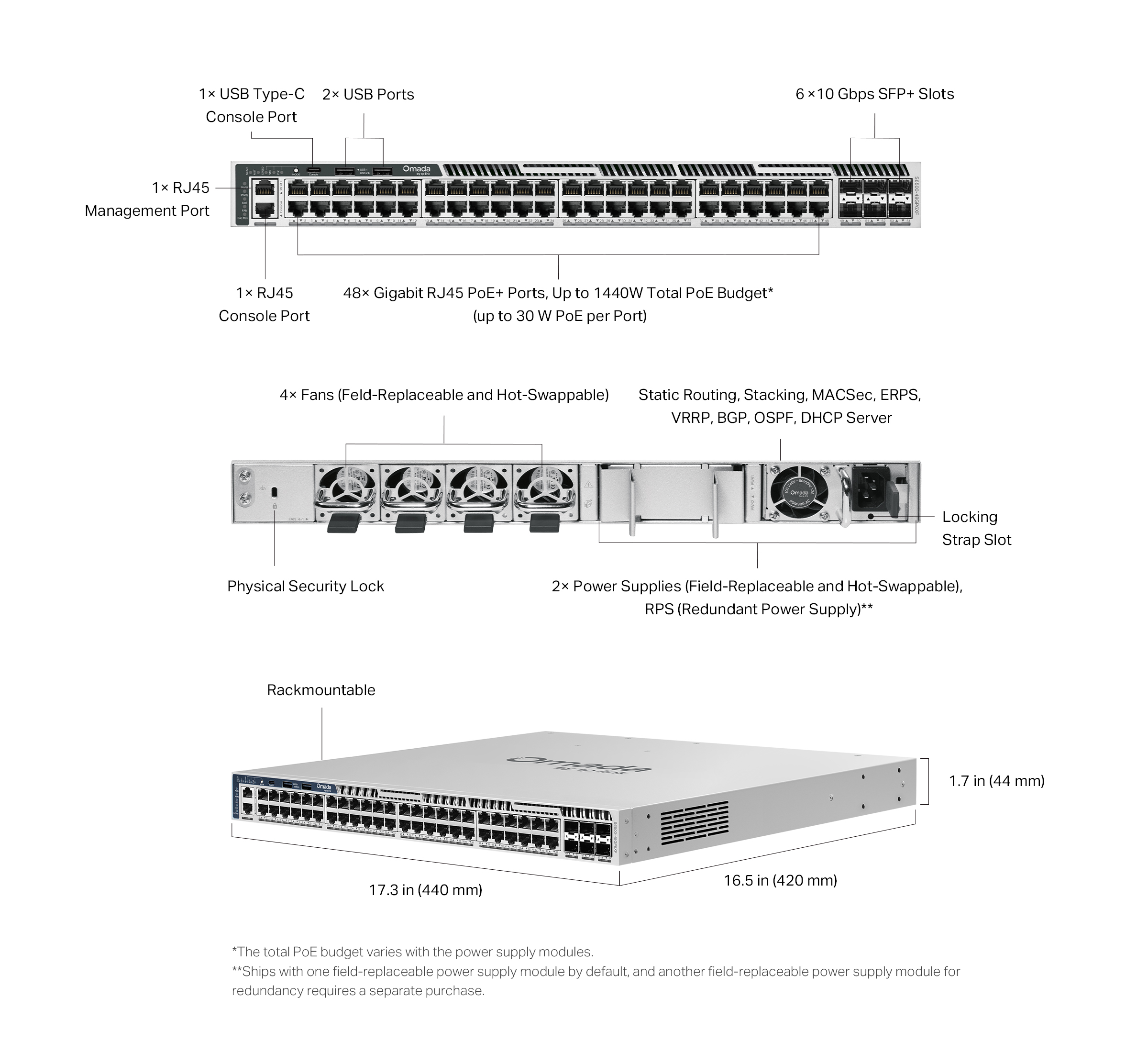 | Interface | • 48× 10/100/1000 Mbps PoE+ RJ45 Ports• 6 × 1/10Gbps SFP+ Slots***• 2× USB 2.0 Ports• 1× RJ45 Console Port• 1× USB Type-C Console Port• 1× RJ45 Management Port |