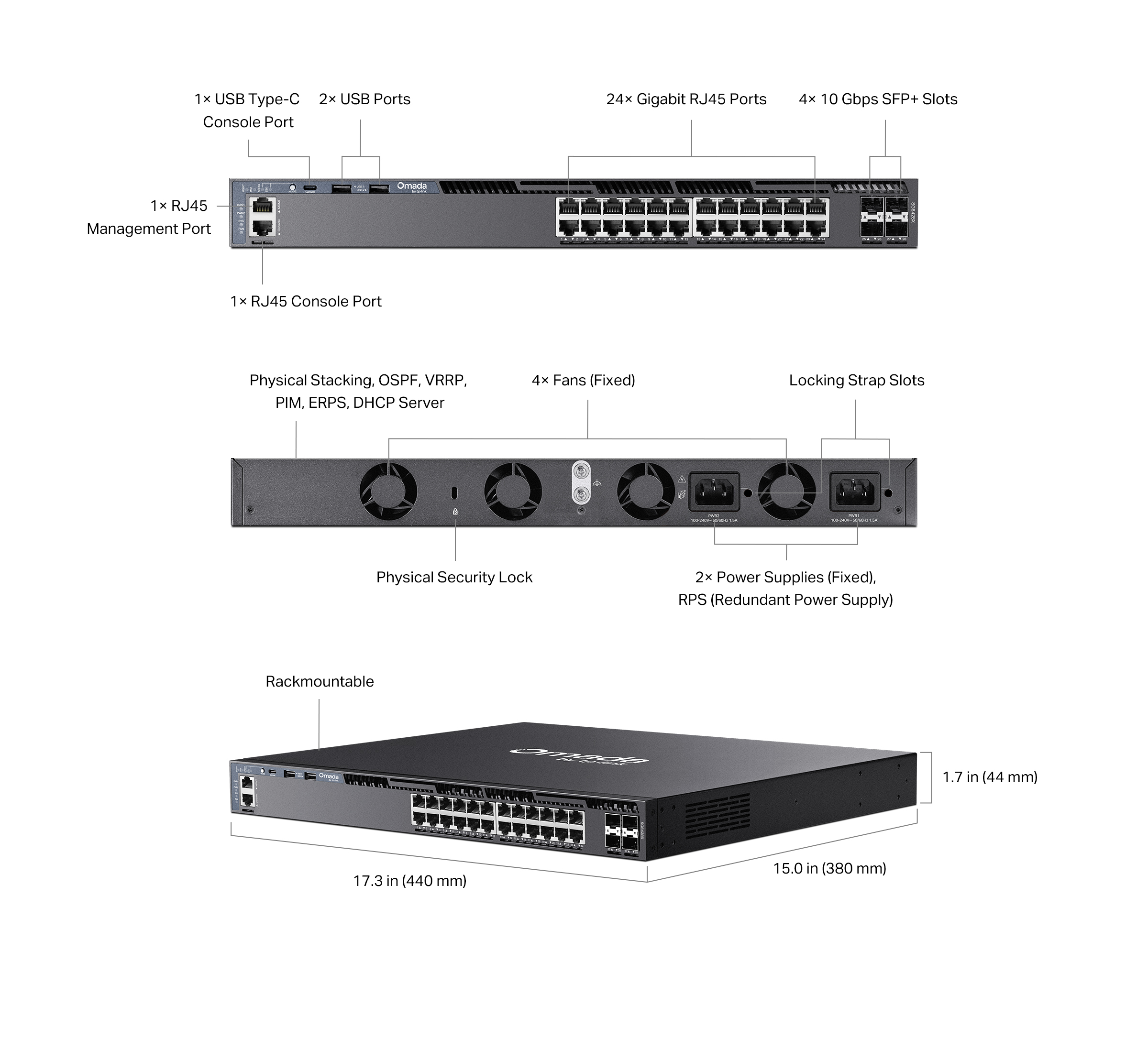 | Interface | • 24× 10/100/1000 Mbps RJ45 Ports• 4× 10G SFP+ Slots• 2× USB 2.0 Ports• 1× RJ45 Console Port• 1× USB Type-C Console Port• 1× RJ45 Management Port |
