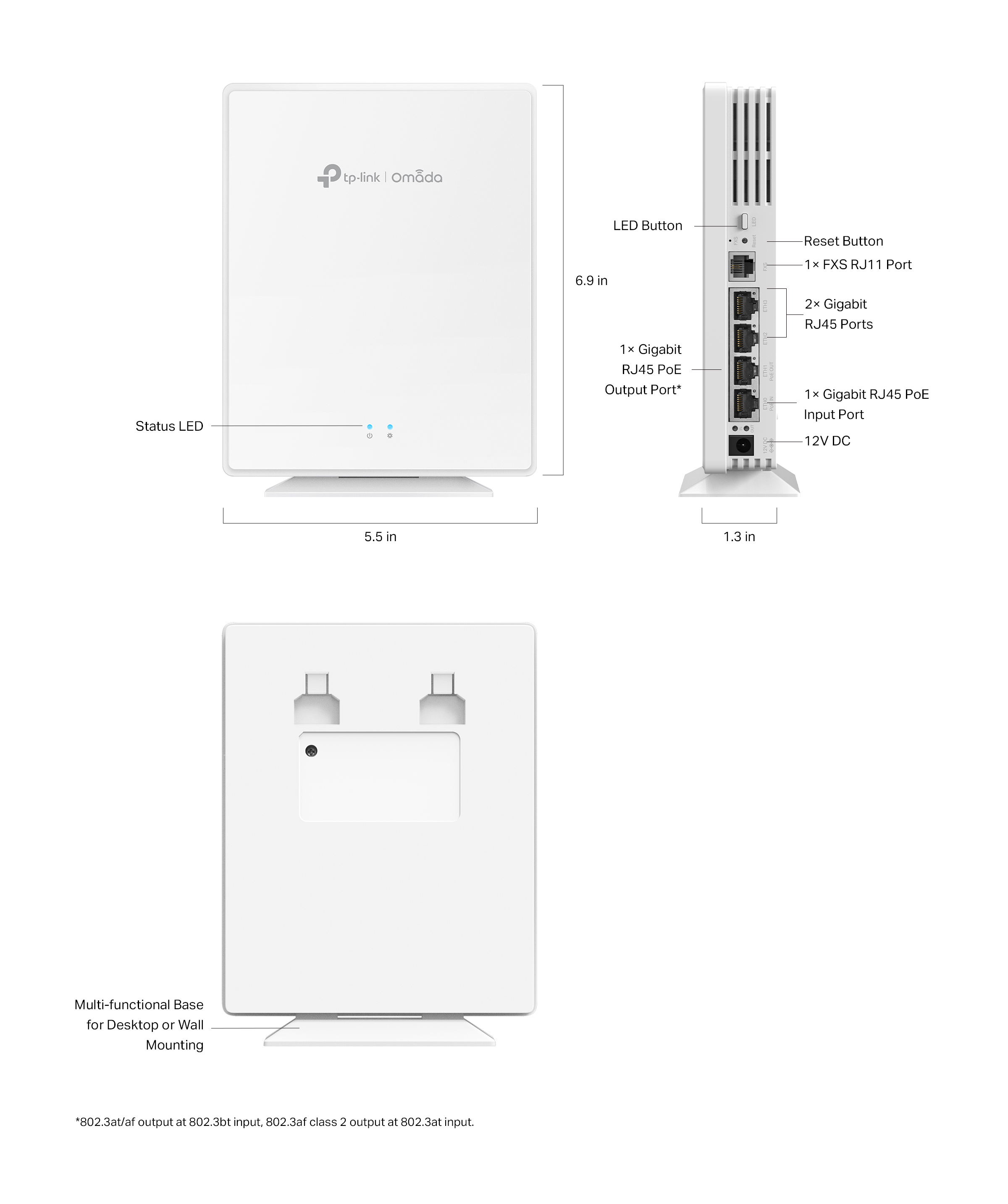 | Interface | 4× 1Gbps Ethernet Ports + 1× FXS Port(One Ethernet port supports PoE Out: 802.3at/af output at 802.3bt input, 802.3af class 2 output at 802.3at input) |