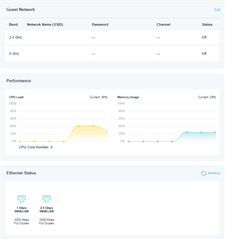 • Ethernet - Displays the current settings of the internet, and you can configure them on the Advanced > Network > Internet page.