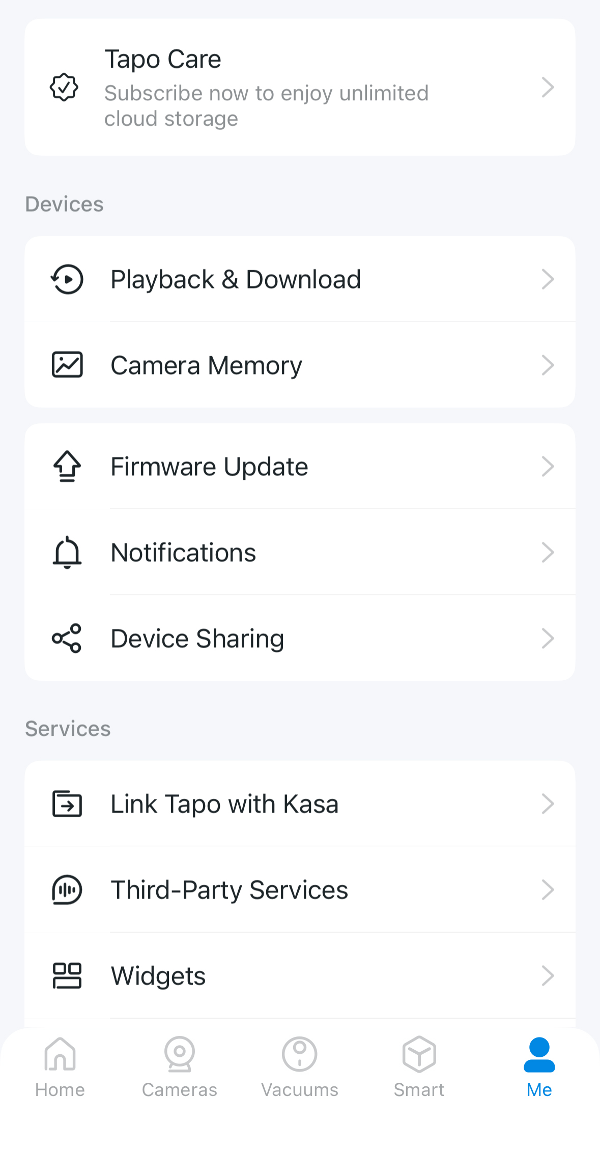 Option 1: Open the Tapo APP, go to Me > Tapo Care. The location of Me button may vary by app version. It is located either in the bottom right corner or top left corner of the app.