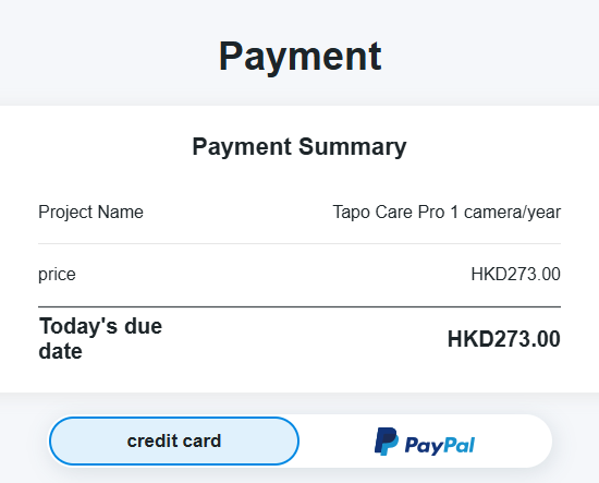 - If you are on Tapo Care website, you can choose to use a credit card or PayPal to complete the payment.