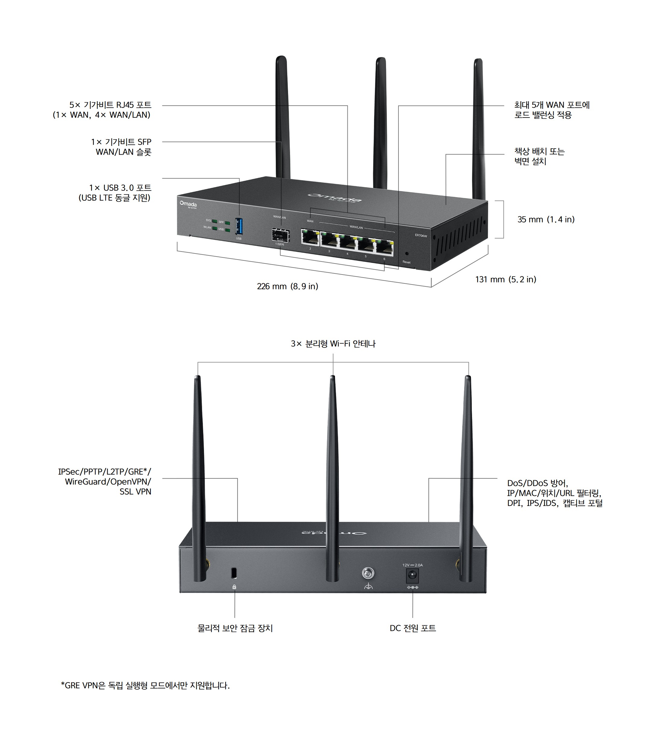 | 인터페이스 및 주요 사양 | • 1× 기가비트 SFP WAN/LAN 포트 • 1× 기가비트 WAN 포트 • 4×기가비트 WAN/LAN 포트 • 1× USB 3.0 (USB LTE 동글 및 USB 스토리지 지원) |