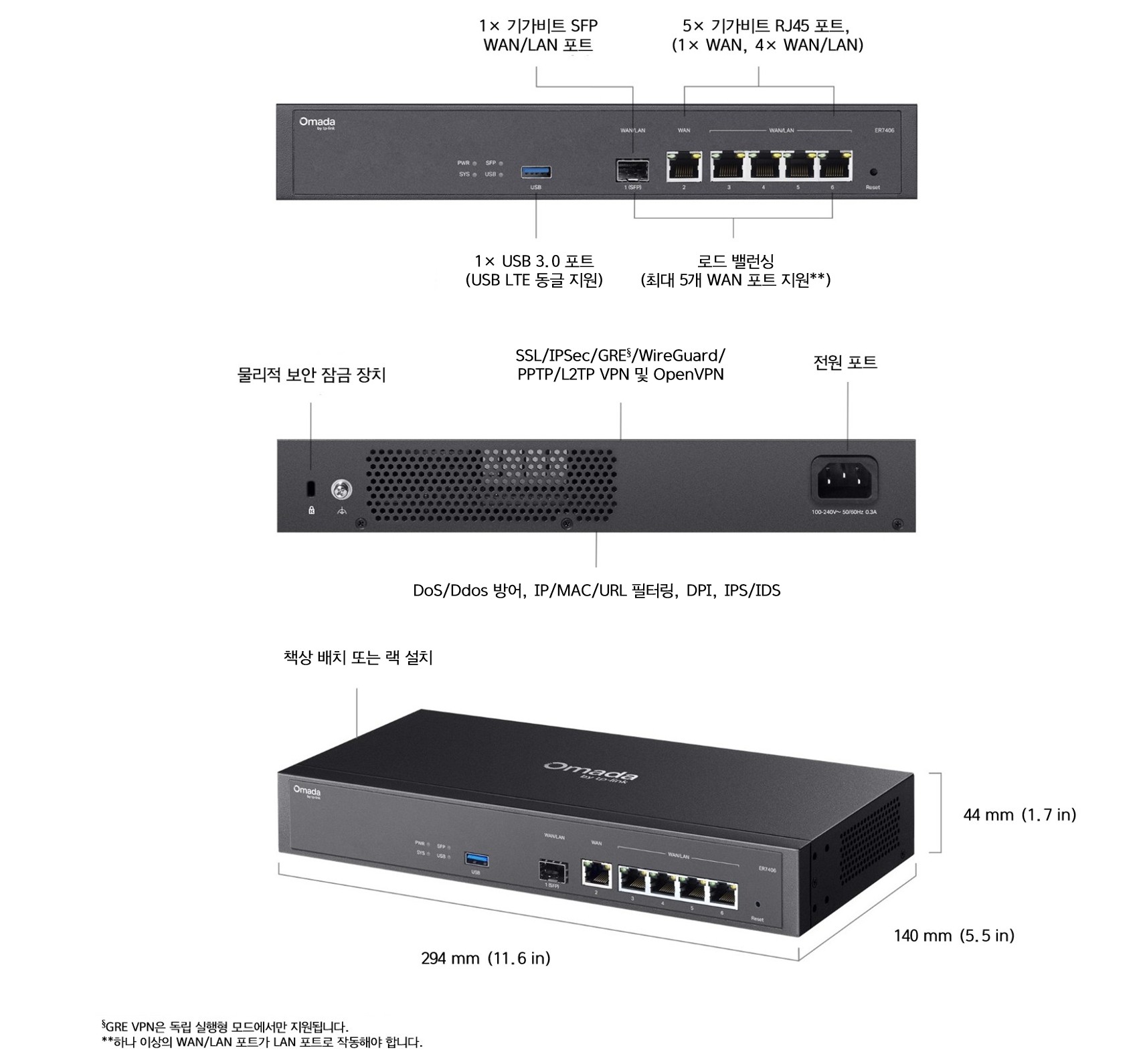 | 인터페이스 및 주요 사양 | • 1x 기가비트 SFP WAN/LAN 포트 • 1x 기가비트 WAN 포트 • 4x 기가비트 LAN/WAN 포트 • 1x USB 3.0 포트 (USB LTE 동글 및 USB 스토리지 지원) |