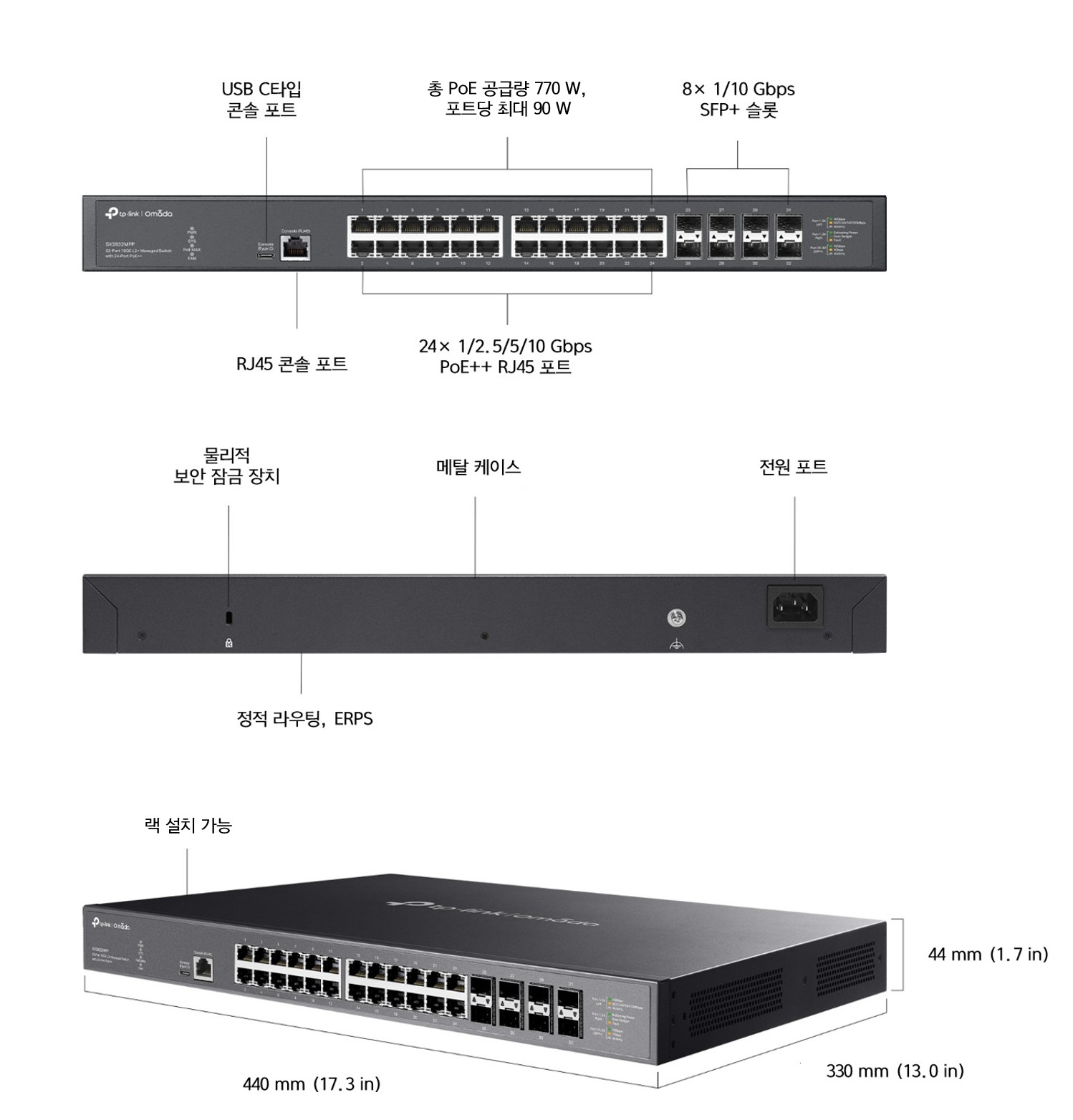 | 인터페이스 및 주요 사양 | • 24× 100 Mbps/1 Gbps/2.5 Gbps/5 Gbps/10 Gbps RJ45 포트 (자동 협상/자동 MDI/MDIX) • 8× 1/10G SFP+ 슬롯‡ • 1× RJ45 콘솔 포트 • 1× USB C타입 콘솔 포트 |