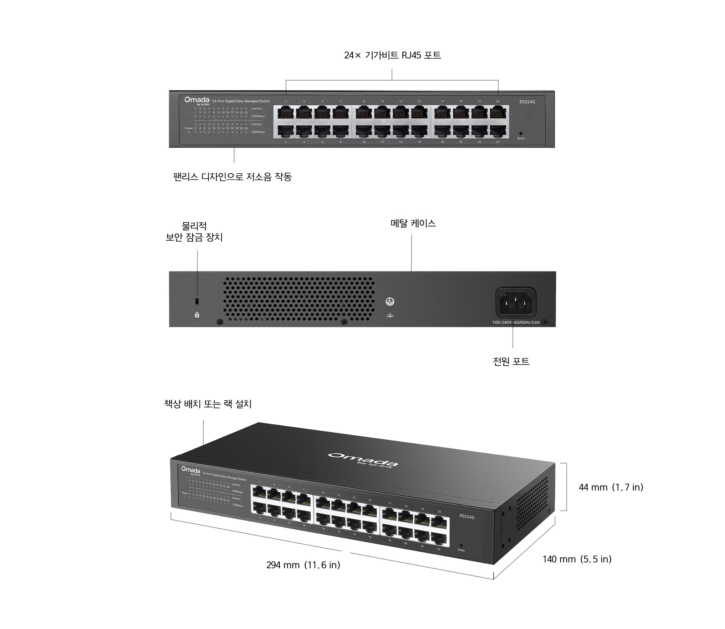 - 견고한 메탈 케이스, 책상 배치 및 랙 설치 가능