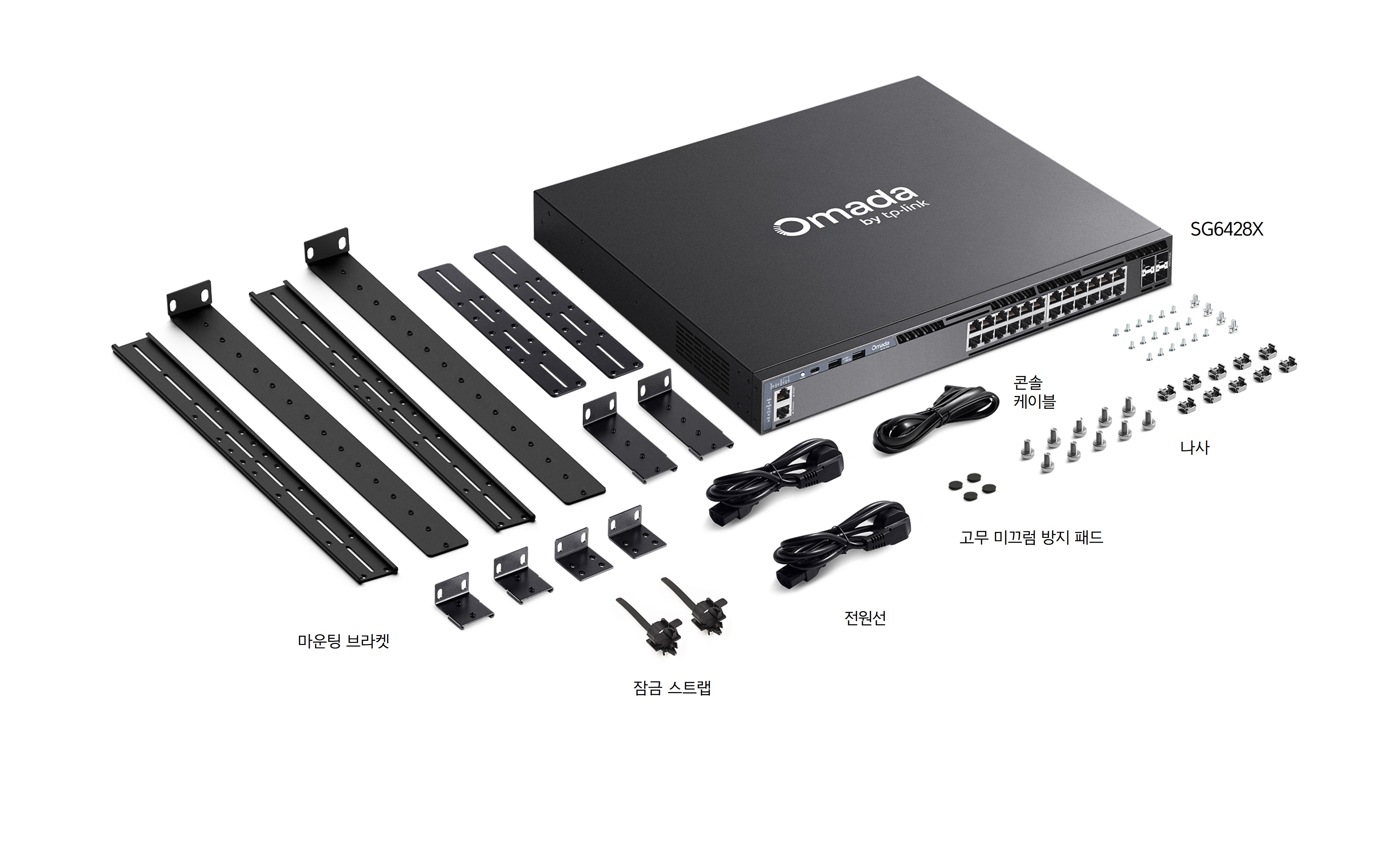 | 구성품 | • SG6428X 스위치 • 전원선 • RJ45 콘솔 케이블 • 잠금 스트랩 • 랙마운트 키트 • 고무 미끄럼 방지 패드 • 빠른 설치 가이드 |