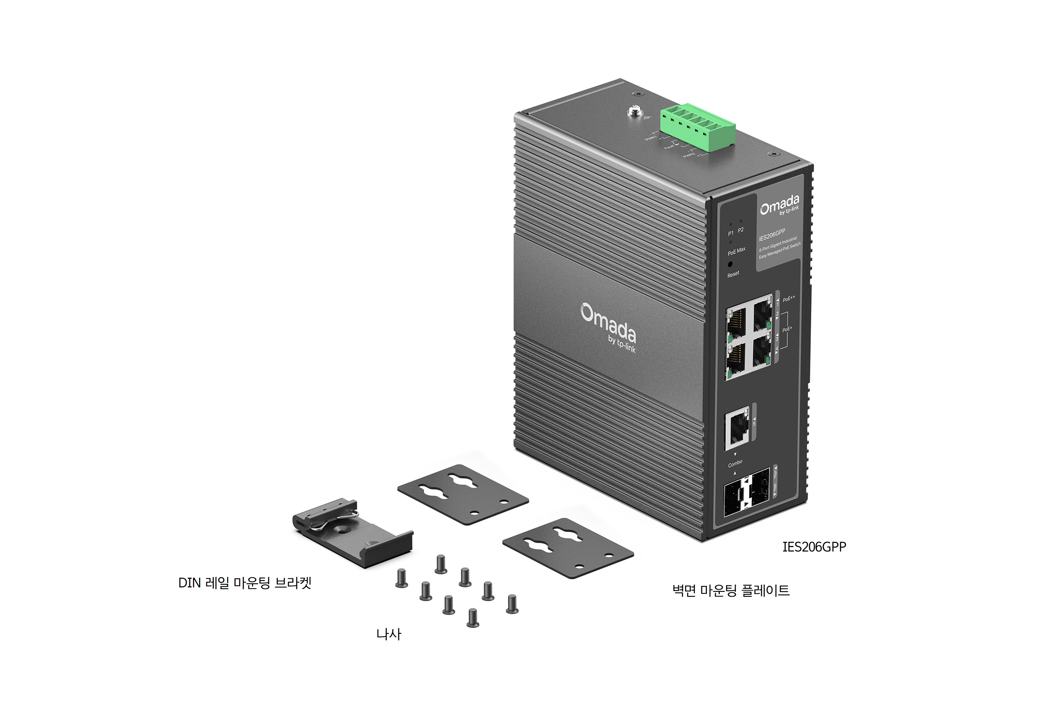 | 구성품 | • IES206GPP • DIN 레일 마운팅 브라켓 • 벽면 마운팅 플레이트 • 설치 가이드 |