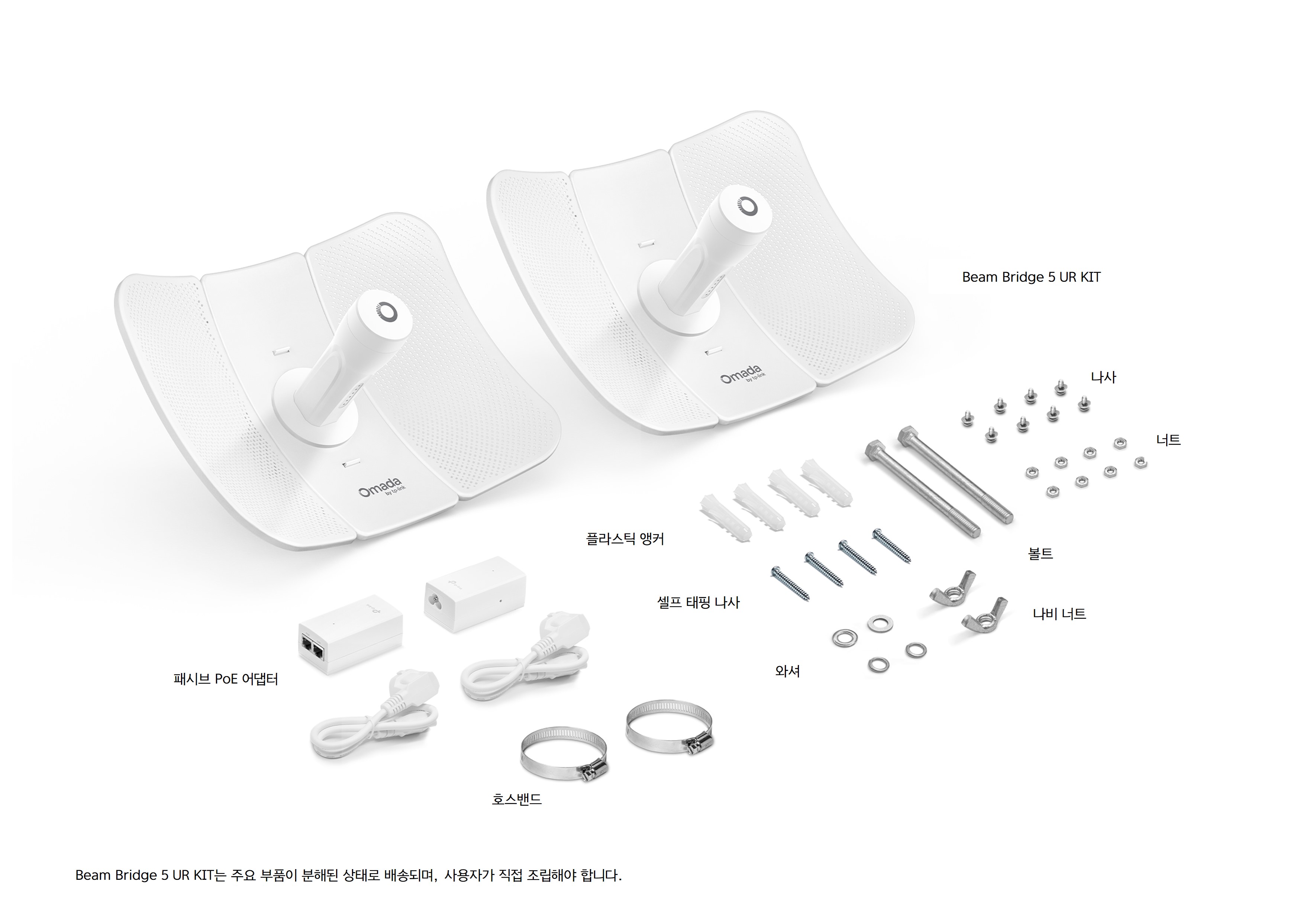 구성품 | • Beam Bridge 5 UR KIT • 설치 가이드 • 마운팅 키트 • 패시브 PoE 어댑터 • 전원 코드 |