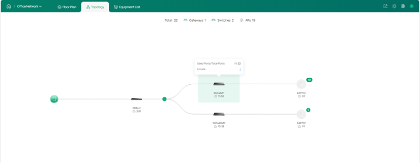 Click Topology on the top to view the network topology of the whole project. Hover over a specific device to check its port usage and locate the device.
