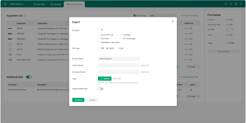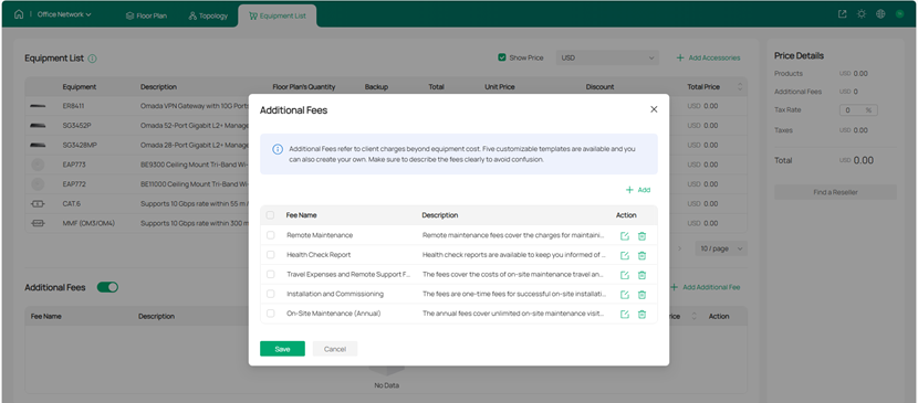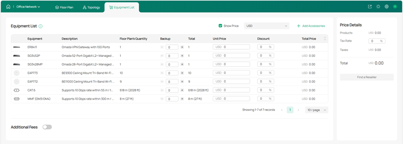 1) Go to Equipment List to check the devices deployed and the accessories. You can specify the quantity and unit price to calculate the total cost of your deployment.