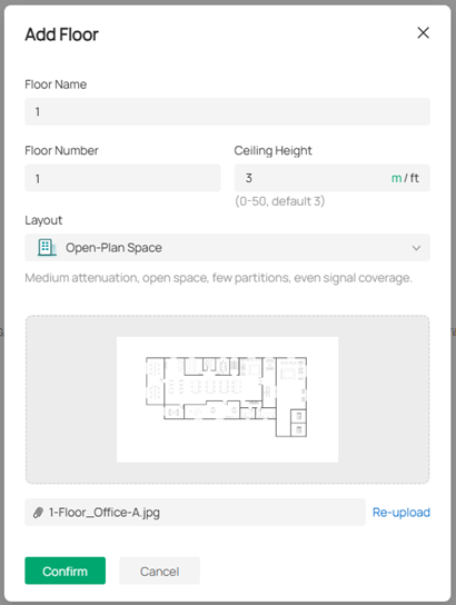 Step 2) Specify the floor name, floor number, and ceiling height. Select a layout most suitable for your map, which will make the simulation more accurate. Click Confirm.
