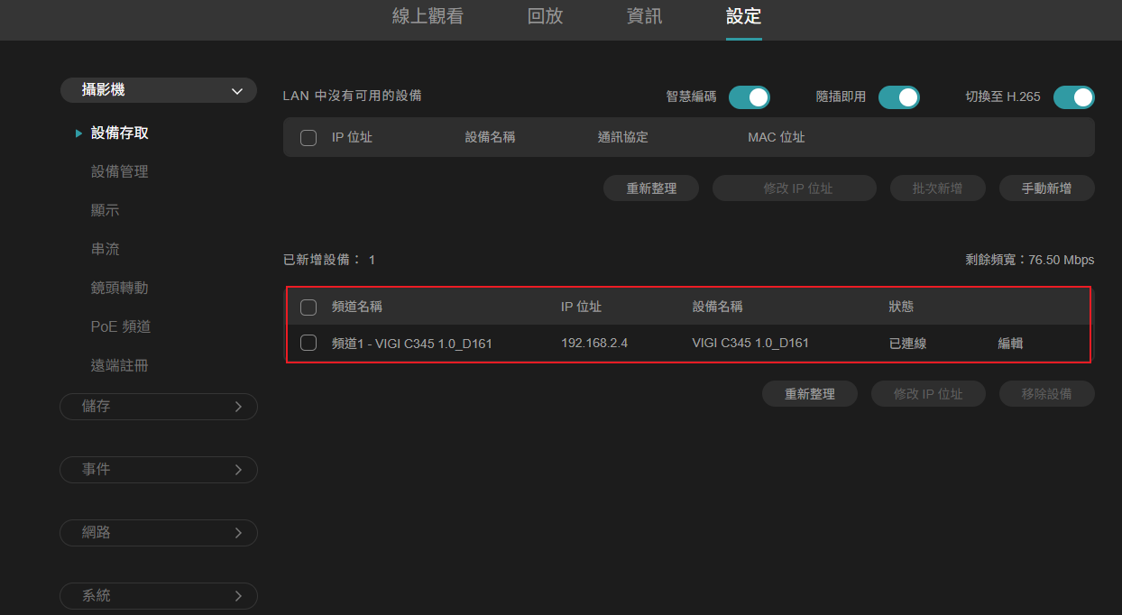 步驟 1. 透過TP-Link 協定新增 直連到NVR PoE埠的VIGI 攝影機。