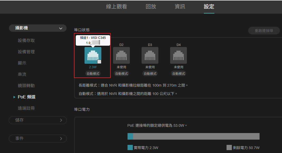 注意:要確認該埠是否正在提供 PoE 供電,可在下方查看其電力消耗狀況, 設定 > 攝影機 > PoE 頻道
