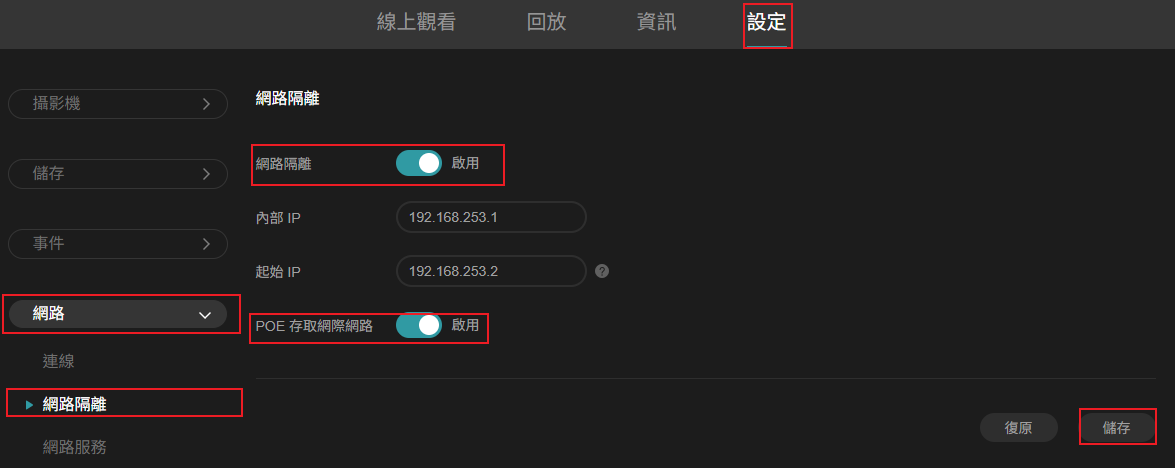 步驟2. 前往 設定 > 網路 > 網路隔離, 啟用網路隔離,設定內部 IP 和 起始 IP,若攝影機需要網路存取,請啟用 PoE 存取網際網路,點擊儲存套用設定。