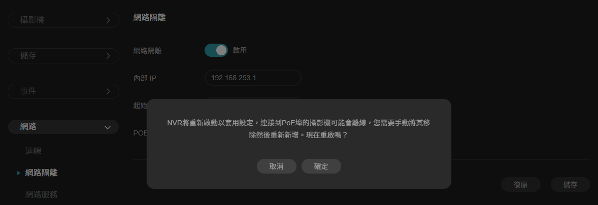 步驟 3. 套用網路隔離設定需要重新啟動 NVR,點擊確定