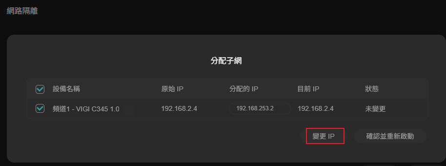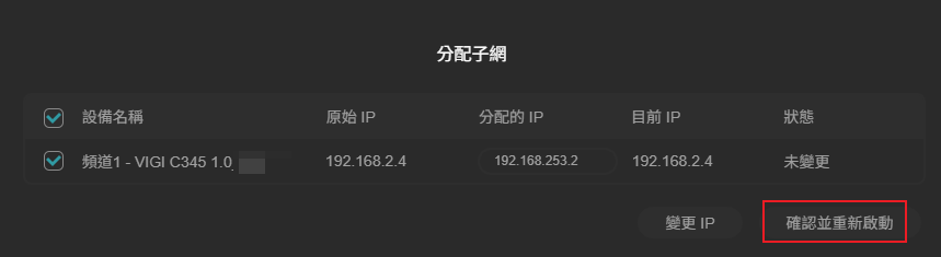 步驟 4. 當分配子網予攝影機時, NVR 會從設定的「起始 IP」開始分配 IP 位址。若需修改已分配的位址,請輸入欲更改的位址並點擊「變更 IP」。當狀態顯示為「已變更」後,選擇「確認並重新啟動」以套用變更。