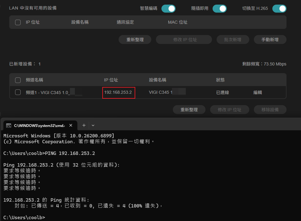NVR重啟後,前往 設定 > 攝影機 > 設備存取 ,確認 IPC 已被分配到隔離子網。從連接至 NVR LAN 網路的電腦對該攝影機的 IP 位址進行 Ping 測試將會失敗。