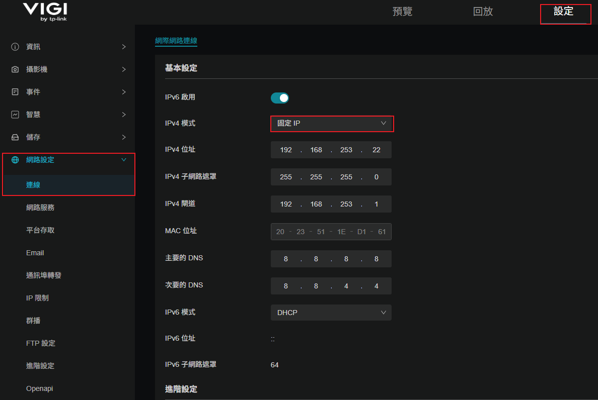 注意:對於直接連接至 NVR PoE 埠的 VIGI 攝影機,啟用網路隔離後,IPv4 模式將被強制設定為固定,子網路遮罩設為 255.255.255.0,IPv4 閘道設定為 NVR 的內部 IP。