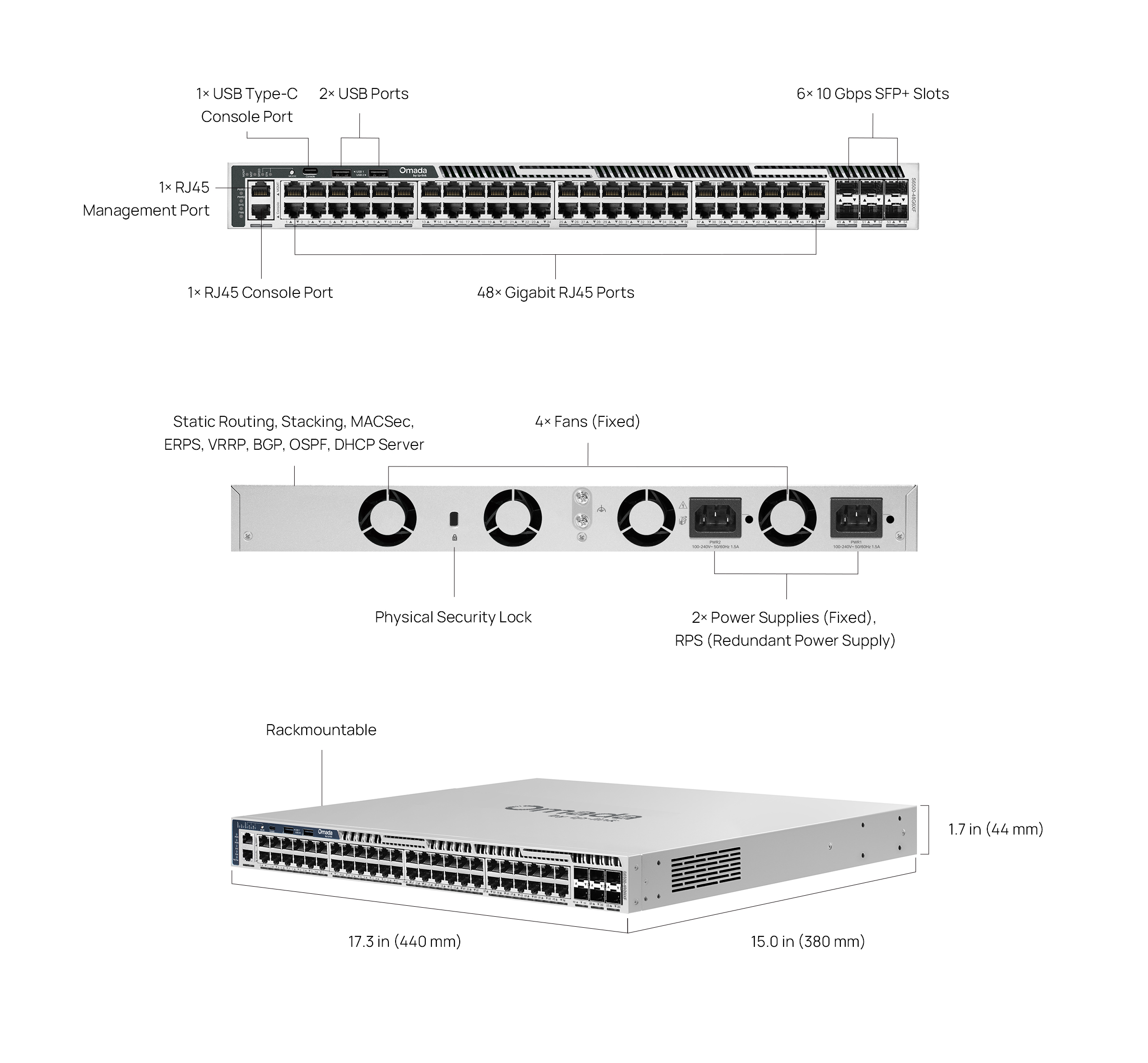 - 48× Gigabit RJ45 ports and 6× 10 Gbps SFP+ slots
